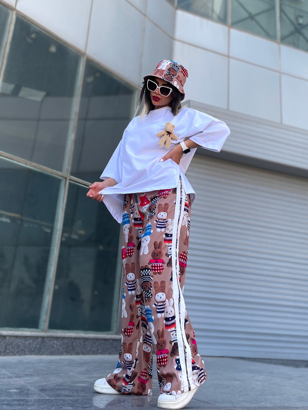 اندازه های کار: قد تیشرت ۷۲ یقه تا سرآستین ۵۶ دور سینه ۱۳۰ - ۱۵۰ دور بازو ۴۸ - ۵۸ قد شلوار ۱۱۲ دور کمر ۶۲ - ۱۱۰ دور ران ۷۴ - ۸۰ دور باسن ۱۴۰ - ۱۵۰ قد فاق ۳۷