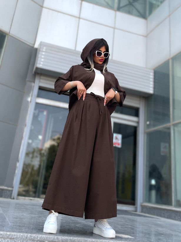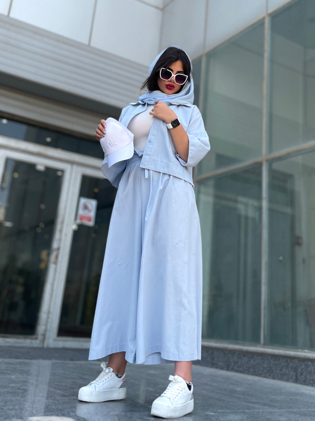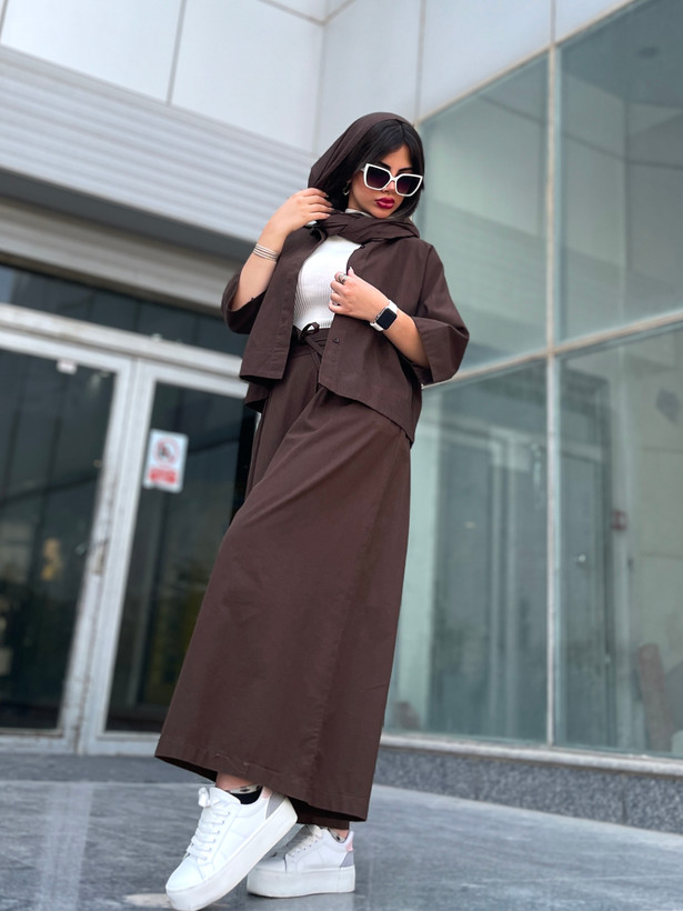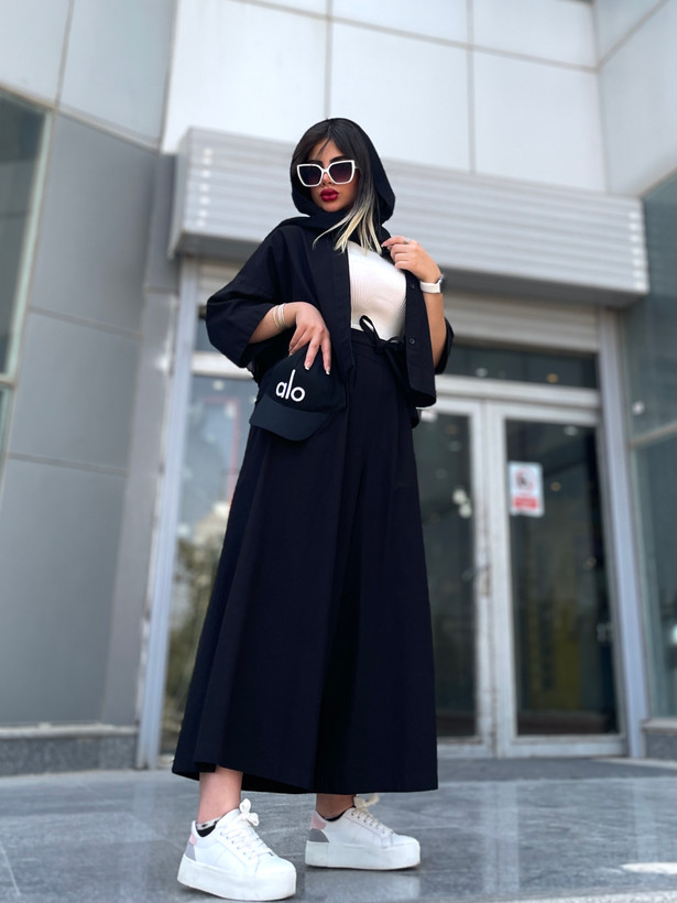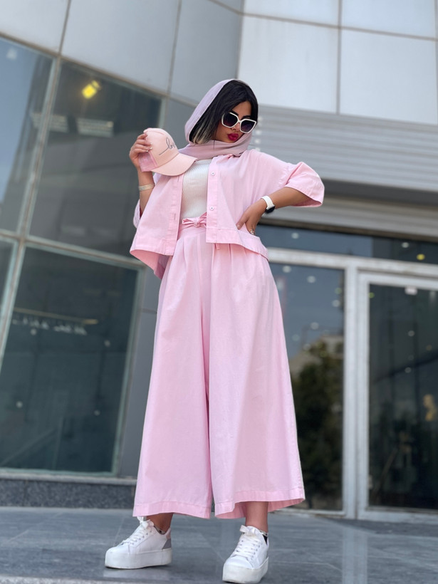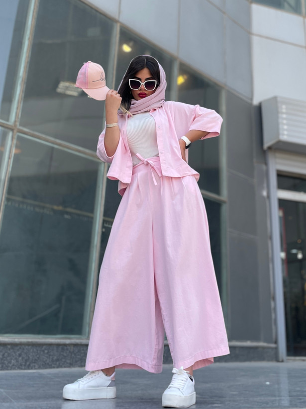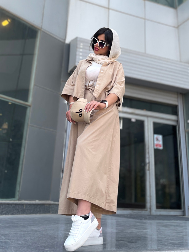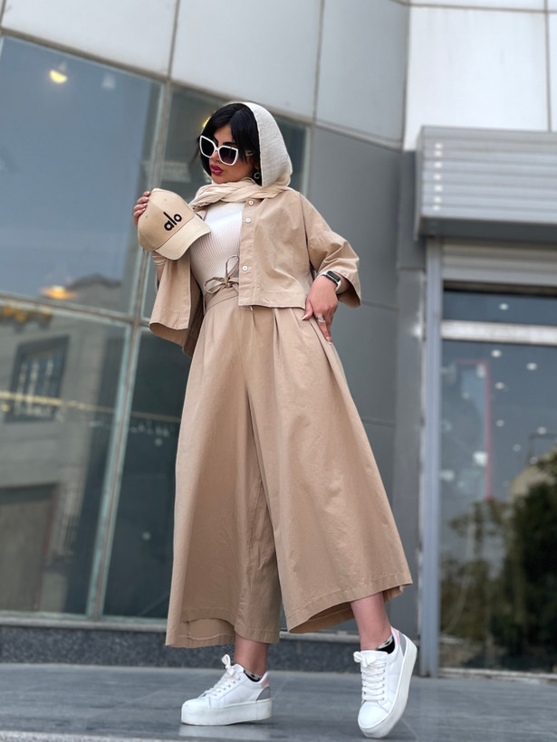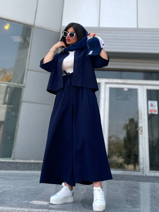 اندازه های کار: قد شلوار دامنی ۹۳ دور کمر ۷۰ - ۹۵ دور ران ۹۶ قد فاق ۴۶ قد شومیز ۵۵ قد آستین ۵۱ دور بازو ۴۲ - ۴۴ دور سینه ۱۲۰ - ۱۲۵