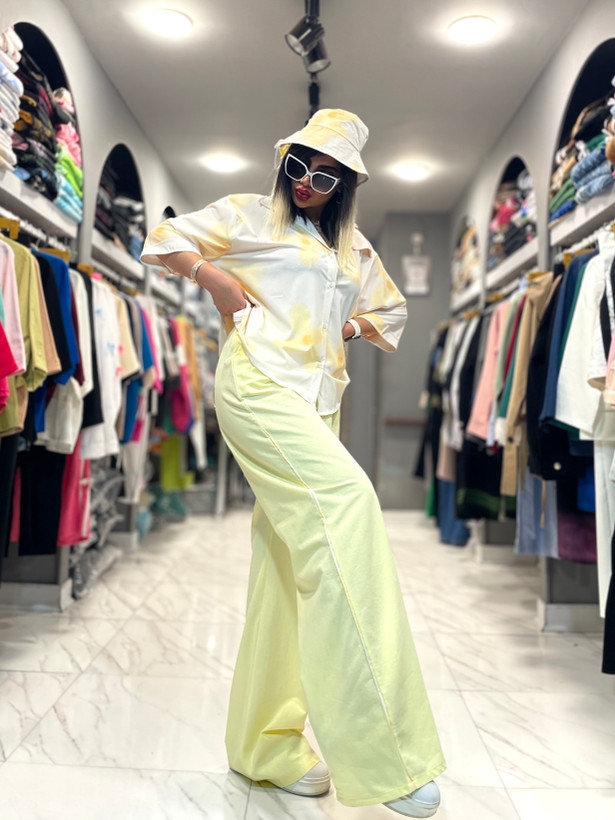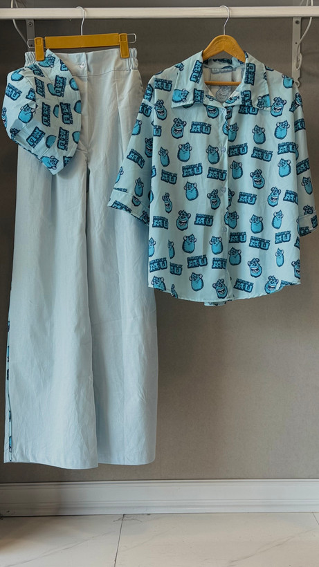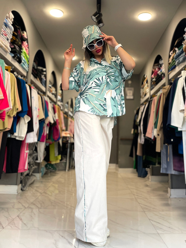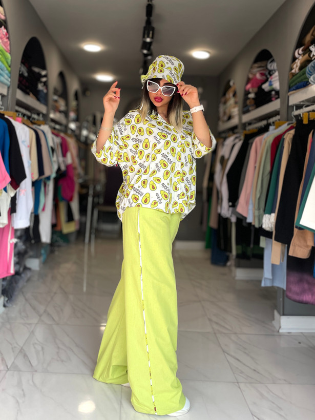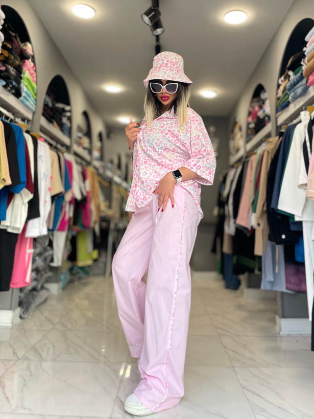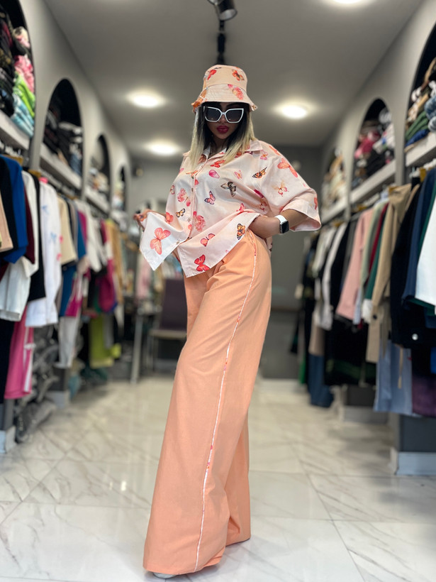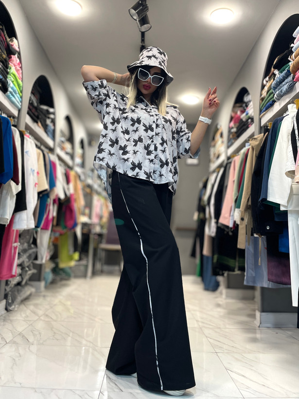 اندازه های کار: قد شومیز جلو ۶۷ پشت ۷۰ قد یقه تا سرآستین ۵۳ دور بازو ۴۴ دور سینه ۱۴۵ قد شلوار ۱۱۶ دور کمر ۶۴ - ۹۳ دور ران ۷۰ دور باسن ۱۳۲ - ۳۸ قد فاق ۳۴